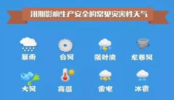 汛期常见的灾害性天气有暴雨、台风、高温和强对流等。 强对流主要包括雷电、冰雹等。 这些天气本身和其导致的次生灾害对公众及社会的安全存在着严重的威胁。 例如,南方地区容易出现由于持续性的强降雨所导致的山洪、泥石流、公路塌方等次生灾害。